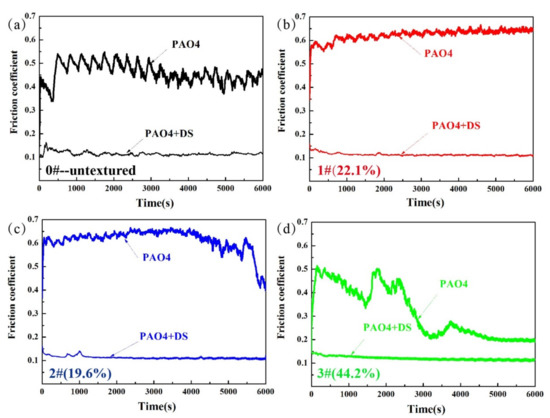 To investigate the effect of DS as an oil additive on the textured surface, the friction coefficient curves of the untreated plate and three types of textured surfaces with DS as additive was compared (Figure 6). The friction coefficients of the 1# and 2# textured plates were relatively higher than those of the smooth plates, implying that surface texturing may result in higher friction force. When the base oil was used, the friction coefficient presented a high value and acute fluctuation. In addition, the friction coefficient exhibited low values and minimal fluctuation under lubricating oil containing 0.01 wt % DS. Since the adhesive wear in 100 °C is very severe, the fluctuation of COF in the untreated sample is the maximum. However, the contact interface of the textured surface is discontinuous, which leads to the fluctuation of the COF decrease. In general, the friction coefficients of samples lubricated by base oil with DS were considerably lower than that of samples lubricated by oil only. Since the DS would come to the friction interface, and the friction mode changed from sliding friction to rolling friction [24], the friction coefficient remained at a constant level of 0.12. An interesting phenomenon was observed on sample 3#. When the test time reached 3000 s, the friction coefficient decreased significantly. Since, in the higher-textured area density, more edges were in contact and so higher pressure build-up would occur. The contact interface would form a lubricating oil film, which separates the two tribo-pairs and reduces friction.