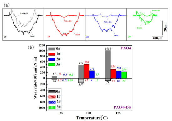 The effect of the textured surface on wear reduction is shown in Figure 7a. The results indicated that: (1) micro-dimples can reduce wear; and (2) the effect of micro-dimples in combination with DS illustrated good tribological properties. Both friction coefficient and wear volume significantly decreased. The wear rate of plates lubricated by oil containing DS was lower than that of plates lubricated by the base oil. Figure 7b indicates that textured plates lubricated by the base oil containing DS exhibited a lower wear rate at each temperature. The additive played a significant role during the test, and the wear rate of the smooth plate lubricated by oil containing the additive reduced to a minimum of 92% at 175 °C compared with that lubricated by base oil. Regardless of the type of textured plates under lubrication, wear rates decreased considerably. Among the samples, 3# + DS possessed the optimal tribological performance. Textured surface was widely associated with possible mechanisms for improvement of tribological property; these mechanisms included (1) secondary lubrication, (2) collect wear debris, and (3) the micro-hydrodynamic effect. Overall, surface texture could reduce friction and wear, and the textured surface combined with the additive exerts the optimal effect under lubrication.