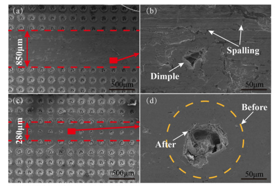 Notable results were observed that combined effect of dimples and additives. Figure 9c,d and Figure 10c,d shows dimples filled with DS additives during the sliding process. The single effect of textured surfaces or additives exhibited good anti-wear performance, whereas the combined effect showed excellent performance. Interestingly, in the case of PAO4 + DS, the depth and width decreased severely, and more residual dimples were detected on the worn surfaces (Figure 10c). Although the SEM images presented a higher amplification factor, the worn textured surface lubricated with oil containing the additive was considerably smoother, and the structure of residual dimples was completely protected. Sample 3# lubricated by oil containing the additive displayed the optimal tribological properties.
