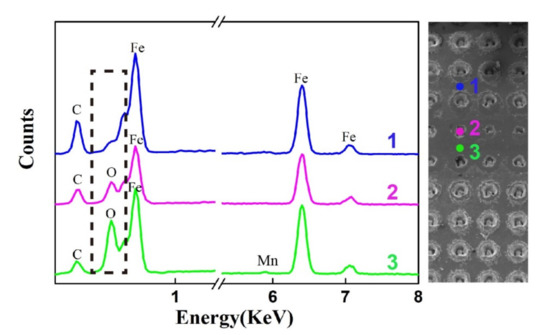 Figure 11 shows the analysis results of EDX spectra and elements content at three different locations: (1) the non-contact of the surface, (2) the worn dimple on the worn surface, (3) the worn surface lubricated by oil containing 0.01 wt % DS. Evidently, O appeared on the worn surface lubricated by the base oil with the additive, whereas only C and Fe were observed on the metallic matrix. In comparison with the non-contact, the lubricated regime may form a tribo-film on the worn surface, which contained Fe, O, C, and Mn [25]. Additinally, the detailed element contents are present in Table 3.