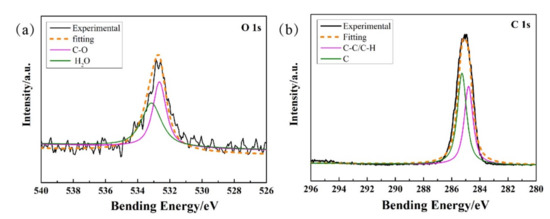 The XPS of textured worn plate lubricated by DS under 100 °C is shown in Figure 12. The O 1s peak is shown in Figure 12a, with a broad asymmetric spectrum that indicates various oxygen bonding environments. The O 1s peak was decomposed into two components, and the binding energies of 532.8 and 533.3 eV was attributed to C–O and H2O, respectively. The XPS of C 1s peaks (Figure 12b) appearing at the bonding energies of 284.8 and 285.18 eV belonged to C–C/C–H and C, respectively.
