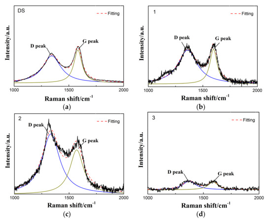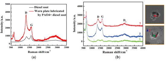 DS can act as numerous balls between the two contact surfaces (Figure 13a) [24]. The spherical structure of DS is destroyed during the sliding process, as can be proven by Raman spectra (Figure 13a). The two obvious peaks in the Raman spectra are the D and G peaks. The D peak at 1320 cm−1 was known as the disorder band, which corresponds to the sp2 hybridized health defects. The G peak at 1580 cm−1 indicates the vibration in all of the sp2-bonded carbon atoms, thereby denoting a “defect-free” graphitic character. The ratio of D and G peak can be used to characterize the sp3/sp2 bonding ratio. The D peak with large width and higher ratio of D and G peak in worn plate than that of the original DS indicates that highly disordered and defect characteristics of the DS particles. The structure integrity break of DS is caused by shear force during the friction process. When the structure integrity breaks, the additives will absorb some of the energy. Thus, the friction pair lubricated by oil with DS exhibits better tribology performance in comparison with pure PAO4.