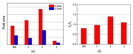 Raman analysis. (a–d) Gaussian fitting applied for D and G peaks fitting of DS and 1#–3#. (e) The fitting results of the D and G peaks intensity, and (f) the intensity ratio of the D peak to the G peak (ID/IG).