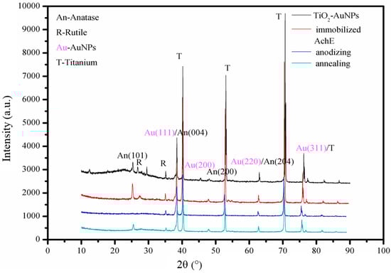 The morphology of TiO2 nanotube array was also useful for separating and directing electrons to the collecting electrode surface, making it an ideal candidate for photocurrent response [23]. However, the large band gap of TiO2 nanotube array (3.2 eV) determined its inherent low photoelectric conversion efficiency in the visible region, limiting its further applications [24]. Hence, Au/TiO2NTs could be employed as the photoelectric transducer in this work, because doping Au has been proved to narrow the band gap and greatly sensitize to the visible light photoresponse [25,26,27]. Figure 1 shows X-ray diffraction (XRD) patterns of the samples. When comparing with pure TiO2NTs as-prepared (blue), characteristic peaks of anatase are appearing at 2θ 25.3° and 47.0° after annealing (green), deposited with AuNPs (black) and immobilized AchE (red), respectively. In addition, Au characteristic peaks could be observed at 2θ 38.20° (111), 44.40° (200), 64.50° (220), and 77.50° (311) after electrochemical deposition.