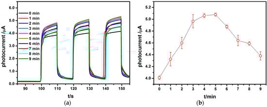 Photocurrent responses of TiO2NTs/Au nanoparticles (AuNPs) after different deposition time (0, 1, 2, 3, 4, 5, 6, 7, 8, 9 min): (a) the photocurrent curves of the TiO2NTs deposited for different times in 0.1 mM HAuCl4·4H2O under deposition potential 0 V; (b) peak currents of the TiO2 NTs for different deposition times (N = 3).