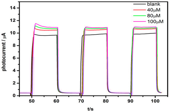 For bioinhibitory sensors, substrate concentration is one of the important influence parameters. AuNPs/AChE/TiO2NTs electrode was placed in different concentrations of ATCl (40 μM, 80 μM, 100 μM) with 0.1 mM, pH = 7.4 phosphate buffered saline (PBS) in order to investigate the effects on the response of the sensor. Embedded AchE biological activity will be affected by the solution pH. According to the literature, the optimal pH of acetylcholinesterase is closed to 7 [29,30]. As shown in Figure 4, the photocatalyses of the enzyme biosensor are found to become more obvious as the concentration of ATCl solution increased. This experimental phenomenon is ascribed to the catalytic reaction of AchE to ATCl. The mercapto that is generated by the catalytic reaction is easily oxidized by the electron-hole pair system that is produced by TiO2NTs, so that the photocurrent response increases. However, when concentration of ATCl is increased more than 80 μM, the change of photocurrent response is very slight, indicating that the catalytic reaction is approached to equilibration. Therefore, the later experiments were performed with ATCl concentrations of 0.1 mM.