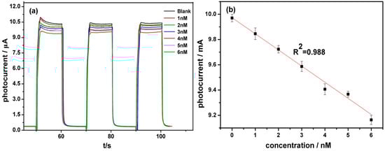 As mixed, AFB1 can inhibit AChE enzyme activity by blocking access of the substrate to the active site or by inducing a defective conformational change in the enzyme through non-covalent bonding interacting with the AChE peripheral binding site. When AFB1 is added, the activity of AchE is inhibited, thereby inhibiting the hydrolysis of ATCl and reducing the generated electroactive substance choline and acetic acid, reducing the oxidation current [31]. When comparing the change of the photocurrent of the enzymatic reaction, the concentration of AFB1 could be obtained via the inhibitory rate of AFB1 to AchE. The responses of the biosensor to AFB1 were recorded with the current-time curve as shown in Figure 5. The attenuation of the photocurrent response is dependent on AFB1 concentration. The peak current is inversely proportional to the analyte concentration, which demonstrates that AFB1 indeed inhibits the catalytic reaction of AchE by the two mechanisms described previously. The response time of the sensor is about 5 s. The time for the calculation curve is selected as the current approached steady state. For example, it is about 55, 75, or 95 s. The linear response range of the biosensor is from 1–6 nM with detection limitation of 0.33 nM, the linear equation is I (μA) = −0.13C (nM) + 9.98 (μA) with a correlation coefficient of 0.988. The results show that TiO2 nanotubes/Au nanoparticles/enzyme photoelectrochemical biosensor has a certain feasibility.