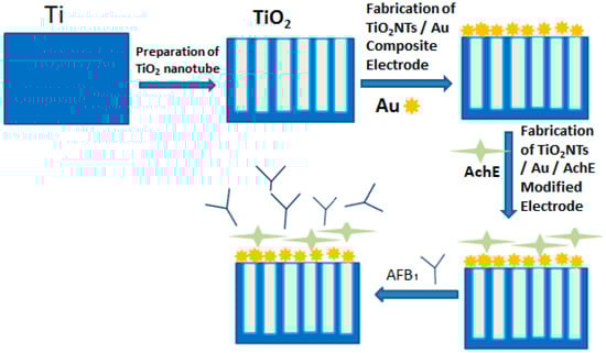 The schematic diagram of the biosensors assembly procedure is shown in Scheme 2. Experiments were performed by placing 100 µL of different concentrations AFB1 on top of the biosensor (i.e., Au/AchE/TiO2NTs) and allowed to stand still for 5 min. The surface of the electrode was gently washed with water and then placed in 0.1 M PBS (c (ATCl) = 0.1 mM, pH = 7.4). Then, the time-current (i-t) curve was used to obtain the peak current value of different concentrations of AFB1 standard solution.