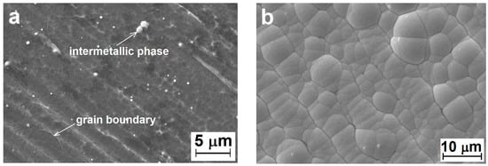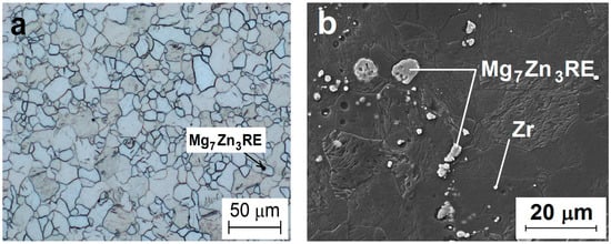 To reveal the ZE10 magnesium alloy microstructure, prepared and polished metallographic samples were poured into an acetic picral etchant (consisting of 4.2 g of picric acid, 10 mL of acetic acid, 10 mL of distilled water, and 70 mL of ethanol) for 3 s and then into 2% Nital for 1 s [19]. The microstructure of the substrate, characterized on the surface parallel to the material processing, was formed by solid solution grains of α-Mg, Mg7Zn3(RE) (La, Ce)-based particles and undissolved Zr particles (Figure 1b) [1,5]. Via EDS analysis, the presence of Ce, La, Pr, and Nd elements was found in the Mg7Zn3(RE) (La, Ce)-based particles.