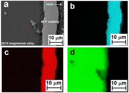 Deposited Ni–P coating with an average thickness of about 10 µm was chosen for EDS analysis (Figure 3). Using EDS mapping analysis, it was determined that the distribution of Ni and P in deposited Ni–P coating was homogeneous in the entire cross section, as shown in Figure 3b,c, respectively. The EDS analysis determined that the Ni content in the deposited Ni–P coating was 95.6 wt % and the P content was 4.4 wt %. Based on the literature [9,29], it was determined that the deposited Ni–P coating is low-phosphorus, as in the cases of the AZ31 magnesium alloy presented in [30] and the AZ61 magnesium alloy in [28].