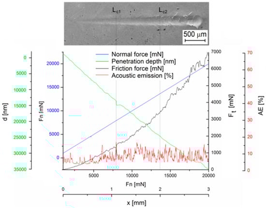 The character of the damage to the locating layer during the scratch test is dependent on many factors [22]. In addition to the influence of the characteristics of the experimental device on the tested layer damage mechanism, there are geometric properties of the substrate-layer system (such as layer thickness, roughness, etc.), experimental parameters (tip and scratch rate), and properties of the substrate-layer system (thermal coefficients, microstructure and internal stresses, elasticity, and hardness modules). Figure 4 and Figure 5 show the scratch track morphology and the layer cracking character, which is similar to the case of Ni–P coatings on AZ31 and AZ61 magnesium alloys presented in [28,30].