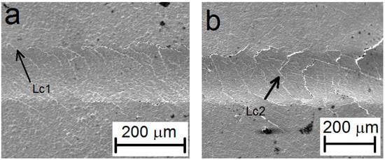 The results of the scratch test performed on the Ni–P-coated ZE10 magnesium alloy sample are shown in Figure 4. The measured values of the critical normal forces Lc1 and Lc2 and the corresponding friction forces Ft1 and Ft2, respectively, are given in Table 2. As indicated by Table 2, the value of the critical normal force Lc1 was 7.9 N, and the formation of oblique and parallel cracks was observed on the coating surface (Figure 5a). The value of the critical normal force Lc2 was 13.6 N, and the formation of transverse tensile arch cracks across the entire width of the track was observed on the coating surface (Figure 5b).