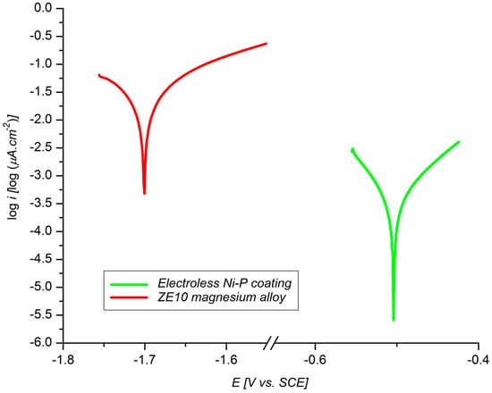 Figure 6 shows the potentiodynamic polarization curves of the ZE10 magnesium alloy and the ZE10 alloy with the deposited Ni–P coating in 0.1 M NaCl obtained at laboratory temperature. The polarization curve of the Ni–P-coated sample is significantly shifted to more electropositive values, which means better corrosion properties of the Ni–P-coated sample compared with the untreated ZE10 magnesium alloy.