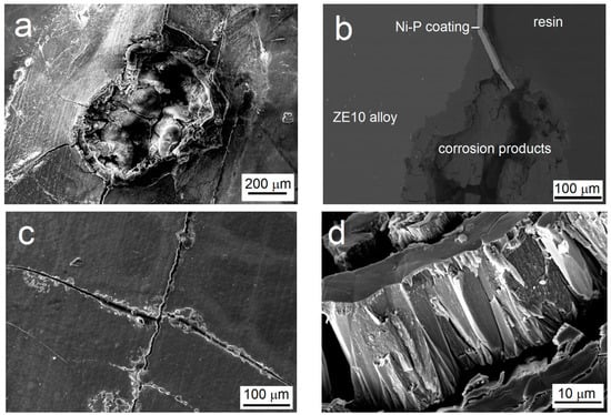 Corrosion degradation of the Ni–P coating on the ZE10 magnesium alloy: (a) surface, (b) cross-section, (c) cracks in Ni–P coating caused by the increase in volume under deposited coating due to the corrosion, (d) cracked Ni–P coating.