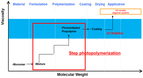 UV-curable oligomers prepared by bulk polymerization underwent the stages shown in Figure 1. During the primary polymerization, the monomers and photoinitiators were added to the polymerization bottle, and the viscosity of the mixture was increased through a short UV-based polymerization. Then, the initiator and reactive diluents were added, and secondary curing progressed after a coating was formed on the surface of the final product or release film. The monomers used in the primary polymerization determined the properties of the final oligomer, while the reactive diluents used during the secondary curing stage significantly affected the curing properties [3,20,21].