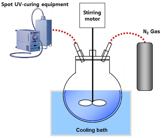 Polymerization was performed in a 500 mL four-necked round-bottomed flask equipped with a mechanical stirrer, an N2 inlet, a thermometer, and an optical fiber of a UV lamp, as shown in Figure 2. The equipment used for polymerization is Spot-Cure (SP-9, USHIO, Tokyo, Japan). The UV lamp used mercury vapor, and the output was 250 W. The major wavelength was 280–320/365 nm. The temperature was maintained at room temperature, and the chemicals were subjected to constant stirring at 100 rpm. After being purged with N2 for 30 min under constant stirring, the monomer mixtures were exposed to the UV lamp (20 mW/cm2) for 70 s at room temperature under a flow of N2. The conversion rate of the primary polymerized polymer was measured to be approximately 20%. The primary polymerized material is called the “prepolymer.” The molecular weights of the prepolymers were measured using a gas permeation chromatography (GPC) system (YL9100 GPC System, YoungLin Instruments, Anyang-si, Korea) equipped with a refractive index detector (YL9170, YoungLin Instruments). The GPC columns were eluted with tetrahydrofuran as the eluent solvent at 35 °C at a flow rate of 1 mL/min. The number-average (Mn) and weight-average (Mw) molecular weights were calculated using a calibration curve for polystyrene as the standard.