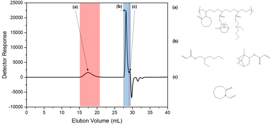 Molecular weights of the prepolymer as determined using gas permeation chromatography (GPC): (a) the polymer-forming section, (b) the section corresponding to 2-EHA/IBA, and (c) the section corresponding to N-vinyl caprolactam (NVC).