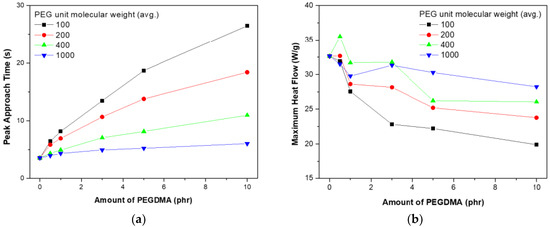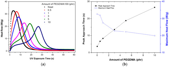 Photodifferential scanning calorimetry (photo-DSC) results for a UV-curing system obtained using poly (ethylene glycol) dimethacrylate with an intermediate molecule size of 100 (PEGDMA100): (a) real-time heat flow; (b) peak approach time and maximum heat flow.