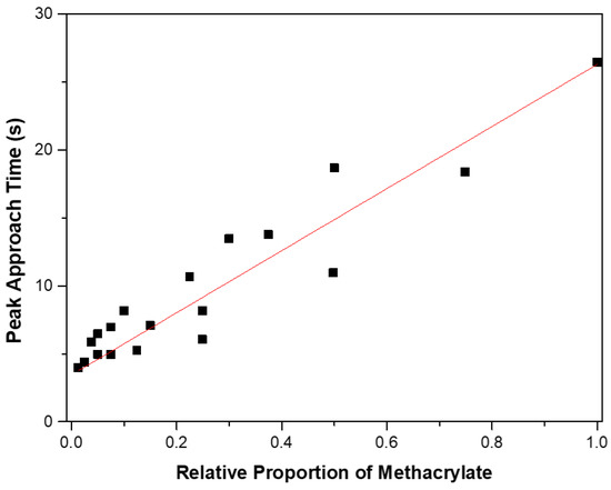 Change in peak approach time with changes in relative proportion of methacrylate (R2 = 0.966).