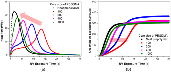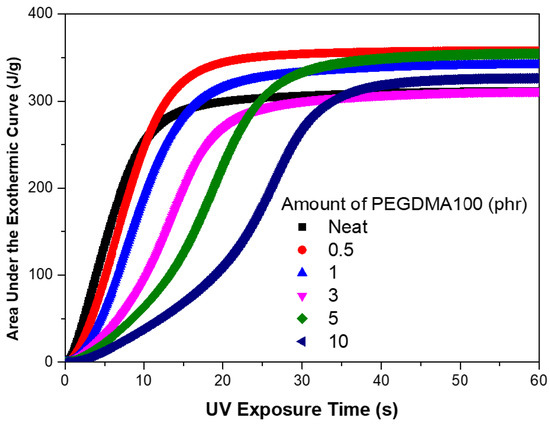 The peak approach time represents the rate of growth and can be employed as an indicator of how fast the chain reaction is in the case of the material reaction initiated by UV curing. Because the structure of the diluent is that of a methacrylate, the reaction rate is low as compared to that of the prepolymer. The reactivity gap between the acrylate and the methacrylate is large in most UV-curable systems [24]. Figure 7 shows the total reaction heat (exothermic area) of the system as determined using PEGDMA100. Based on the results of photo-DSC, the exothermic area was calculated; this was reflective of the total heat flow. The exothermic area was determined to be larger than the neat area for all conditions. The reaction rate of the methacrylate structure was low. However, the structure contained molecules that induced the overall reaction by creating a bridge in the middle. Therefore, the total heat of reaction was higher compared to that in the case of the neat prepolymer.