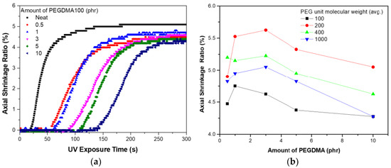 Shrinkage ratio of a UV-curable system (a) when using PEGDMA100 and (b) for different PEGDMA sizes.