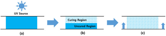 Controlling the shrinkage is the most important aspect of synthesizing UV-curable materials, as these materials shrink rapidly during the curing process, with the theoretical shrinkage rate being more than 20% [17]. This phenomenon of shrinkage can induce warpage in the material and generate internal stress, which can lead to defects in the finished product.