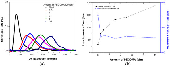 Analysis of shrinkage rate of a UV-curable system using PEGDMA100: (a) shrinkage rate; (b) peak approach time and maximum shrinkage rate.
