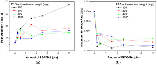Shrinkage rates for different PEGDMA sizes: (a) peak approach time; (b) maximum shrinkage rate.