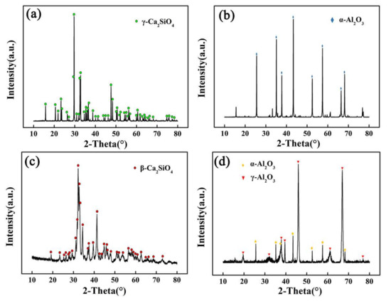 γ-Ca2SiO4 is the stable phase at room temperature. It is generally believed that the higher the formation temperature, the higher the hydration rate, so the hydration rate rank of the different phase is α > αH’ > αL’ > β > γ [16]. Previous investigations indicated that γ-Ca2SiO4 almost cannot react with water [17], while β-Ca2SiO4 can react with water to generate gel of hydrated calcium silicate. The alumina powders were α-Al2O3, but as-sprayed coating contained α-Al2O3 and γ-Al2O3. A part of α-Al2O3 transformed into γ-Al2O3 during the plasma spraying process. The phase of Al2O3 coatings produced by plasma spraying mainly existed in γ-Al2O3 phase [18].