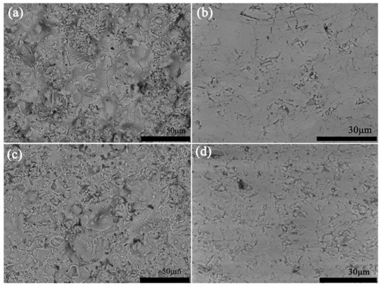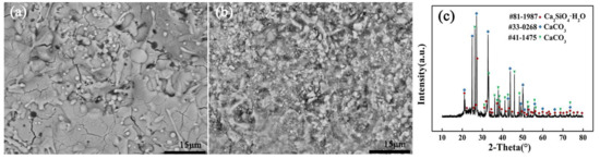 From Figure 9 and Figure 12, it is concluded that Ca2SiO4 coating becomes denser, the micro cracks and pores are filled with hydration products, such as C–S–H gel and CaCO3. The dense internal structure is beneficial in isolating the metal substrate from the corrosive medium. Al2O3 coating becomes loose and porous after being immersed for 30 days. Corrosion medium attacked the metal substrate under Al2O3 coating.