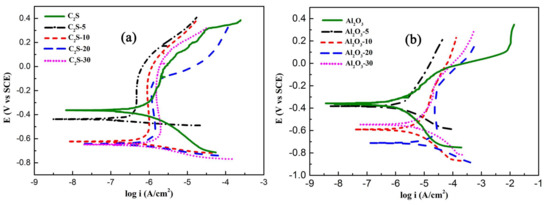 From Figure 13a, Ca2SiO4 coatings show obvious passivation phenomenon. Ca2SiO4 coatings released a lot of Ca(OH)2 into NaCl aqueous solution. The solution was alkaline and the pH was above 8.0, although the dissolution of CO2 gas in air may decrease the pH value. The alkaline environment was in favor of the formation of passivation film [23]. Therefore, Ca2SiO4 coating promoted the formation of passivation film and passivation film could protect the metal from corrosion effectively. Only Al2O3-20 showed the passive behavior for Al2O3 coating. The passivation film might form partly. On the other hand, pitting corrosion occurred easily when the Al2O3 coating was loose. So, the corrosion current density was very large, the Rp was very low. For Al2O3-30, the corrosion product possibly blocked up the crack and pores in the coating, the corrosion rate reclined and current became lower; Rp increased to 6.36 kΩ·cm2. From the potentiodynamic polarization curves and corrosion parameters of Ca2SiO4 and Al2O3 coatings, it could be concluded that Ca2SiO4 coating was more corrosion-resistant than Al2O3 coating.