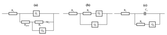 The equivalent circuits for Ca2SiO4 coatings: (a) as-sprayed C2S; (b) C2S-5; C2S-10, C2S-20; (c) C2S-30.
