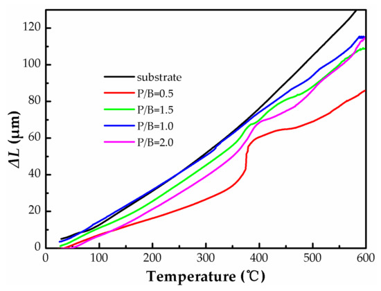 To further study the mechanical performance of the polysiloxane/Al coatings, thermal mechanical analysis (TMA) was used to measure the thermal expansion dimension (ΔL) of the polysiloxane/Al coatings in the horizontal direction at different temperatures. The resulting TMA curves are shown in Figure 7. For a P/B ratio of 0.5, the content of the polysiloxane resin is relatively higher. The main chains of the resin are broken at high temperatures, which result in a massive volume shrinkage of the polysiloxane/Al coating [23]. As a result, the ΔL of the coating is much lower than the substrate from 50 °C to 600 °C. The mismatch of ΔL would induce a strong shrinkage stress inside the coating causing the coating to crack and peel off above 400 °C.