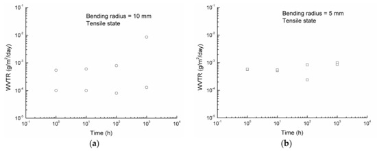 WVTR change of barrier film bent in tensile state: (a) bending radius of 10 mm; (b) bending radius of 5 mm.