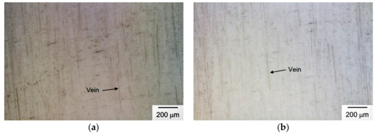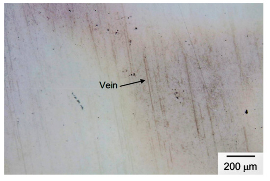 An OM micrograph of an as-received barrier film is shown in Figure 8, which reveals some randomly distributed veins. These randomly distributed veins are present in every barrier film and are presumably formed in the fabrication process. As described in the previous section, for a bending radius of 5 and 10 mm, no significantly detrimental effect is found for tensile bending up to 100 h and for compressive bending up to 1000 h. Exemplified OM micrographs of these bent specimens are given for comparison with the as-received one. Figure 9 shows the OM micrographs of the barrier films after tensile bending with a 5-mm and a 10-mm curvature radius for 100 h. OM micrographs of the barrier films after compressive bending with a 5-mm and a 10-mm curvature radius for 1000 h are shown in Figure 10. Morphologies of these bent barrier films (Figure 9 and Figure 10) are almost the same as those of the as-received barrier film (Figure 8). This is consistent with the WVTR measurements which do not significantly change under these bending conditions.