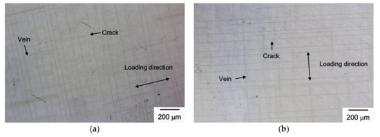 As mentioned in Section 4.1, the highest WVTR values of the barrier film are about 8.5 × 10−3 and 1 × 10−3 g/m2/day when subjected to tensile bending of a radius of 10 and 5 mm for 1000 h, respectively. OM micrographs of these two barrier films are shown in Figure 11. As shown in Figure 11a, cracks are found in the barrier film after tensile bending of a radius of 10 mm for 1000 h. These cracks are perpendicular to the direction of applied stress, roughly parallel to each other, and appear as straight lines, as expected. The average crack density in the barrier film is about 14 cracks/mm, as shown in Figure 11a. Similarly, Figure 11b shows the formation of cracks in the barrier film after tensile bending of a radius of 5 mm for 1000 h. Again, these straight cracks are perpendicular to the loading direction and parallel to each other. The average crack density in the barrier film is about 13 cracks/mm, as shown in Figure 11b. These cracks could serve as pathways for water vapor to penetrate through the barrier film. However, cracks do not appear in every specimen after tensile bending with a radius of 10 mm or 5 mm for 1000 h. For example, the lower WVTR value in tensile bending with a 10-mm curvature radius is 1.3 × 10−4 g/m2/day after 1000 h of bending, as shown in Figure 6a. These specimens do not exhibit visible damage under OM and their WVTR values do not significantly increase, either. The possible reason is that cracks might develop at pre-existing defects and lead to the rupture under bending [38,39]. As the pre-existing defects are not evenly distributed in the barrier film and the number of defects might vary with sample, they would influence the probability of crack formation and are responsible for the scattering in WVTR data.