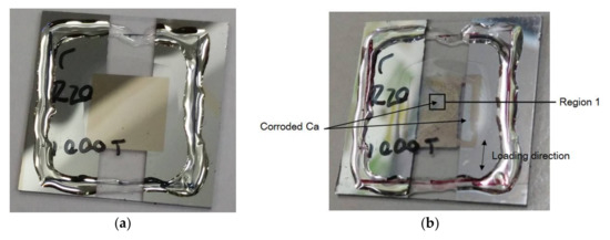 After the static bending test, an electrical Ca corrosion test is employed to measure the WVTR, as shown in Figure 3. Flexible barrier specimens which have been subjected to a certain time period of static loading were dried at 80 °C for about 30 min and transferred to a glove box system to fabricate Ca sensors. Note that glass is assumed as an impassable substance. Thus, glass substrate is capable of preventing significant moisture passing through it for a long period of ambient moisture immersion. It is applied as a protective substrate in the Ca corrosion test, as shown in Figure 3. 1-mm-thick glass substrates were firstly cut into 25 mm × 25 mm pieces. After being carefully cleaned and degassed at 120 °C for about 15 min, each glass substrate was put into the glove box system. Applying a thermal evaporation approach, a 100-nm-thick Al layer was uniformly deposited onto the glass substrate to serve as Ca sensor electrodes. In addition to depositing an Al film, the glass substrate was covered at the center with a Ca layer of 250-nm thickness. To attach the flexible barrier specimen to the Ca-Al-deposited sensor, a UV epoxy (UV epoxy-EPO-TEK®OG142, Epoxy Technology, Inc., Billerica, MA, USA) was pasted at the edges of the barrier film to bond with the Al layer using a UV-curing light source. To avoid the unwanted influence of ambient environment which may damage the Ca sensor, all the preparation processes of Ca sensor were performed in a glove box system with a water vapor less than 10 ppm. Before taking out the Ca sensors from the glove box, all of them were sealed in Al foil bags and then shipped to another laboratory to measure WVTR value. This approach of storage and shipping of Ca sensor follows the procedures given in the study of Subbarao et al. [34].