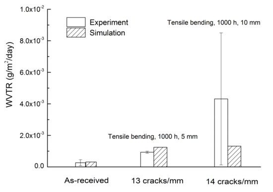 In this study, crack densities of 13 and 14 cracks/mm are separately established in the 3D FEM model to compute the expected WVTR of the given barrier film. Note that these crack densities considered in the 3D FEM model are observed in the OM micrographs of mechanically bent barrier specimens (Figure 11). As described in Section 4.2, these cracks serve as major pathways for moisture to diffuse through the barrier thin film. They lead to an increase in WVTR of the barrier thin film. The expecting WVTR of the 3D FEM barrier model is then calculated to make a comparison with the experimental results. The simulation of WVTR variation as a function of moisture exposure time for the as-received and damaged barrier specimens is shown in Figure 13. As shown in Figure 13, WVTR of the damaged barrier film significantly increases due to presence of cracks. Apparently, a larger crack density results in a higher WVTR (Figure 13). As expected, accumulation of cracking leads to an increase in WVTR of barrier film as a result of an increase in moisture exposure area and entrances. The comparison between numerical and experimental results of WVTR is shown in Figure 14. The average value of WVTR is represented by the height of a certain column and the maximum and minimum WVTR values correspond to the ends of each error bar (Figure 14). As shown in Figure 14, the WVTR values computed using the 3D FEM cracking model agree with the experimental results. The numerical results indicate that the 3D FEM model can be used to predict the WVTR change of a barrier film based on the identified crack density. The 3D FEM model developed shows a good quantitative validation for such a failure mechanism. The present findings of this study could provide an insight into the improvement of encapsulation performance and prevention of damage development of such barrier film.