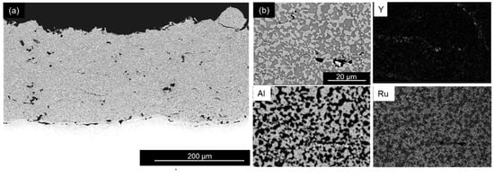The cross-section of heat-treated coatings and EDS mapping results are shown in Figure 2 and Figure 3 for the C1 and C2 coatings, respectively. A characteristic splat-on-splat structure can be seen with pores and cracks marking the splat’s boundaries. After the solution and aging heat treatment, a typical β + γ microstructure formed in the coatings (β phase in dark grey). The EDS mapping results are shown in Figure 2b, Ru has a similar pattern as Al indicating that Ru has a higher solubility in β phase than in γ phase, which is also confirmed by EDS point analysis showing a 4.8 wt % for Ru in β phase, compared with 1.1 wt % for Ru in γ phase. Y and Ce were mainly segregated to the splat’s boundary according to the EDS mapping (Figure 2b and Figure 3b) due to their affinity for oxygen.