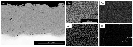 BSE image showing the cross-section of heat-treated coating of C2 (a) and EDS mapping of Ce, Al, and O in the heat-treated coating (b).