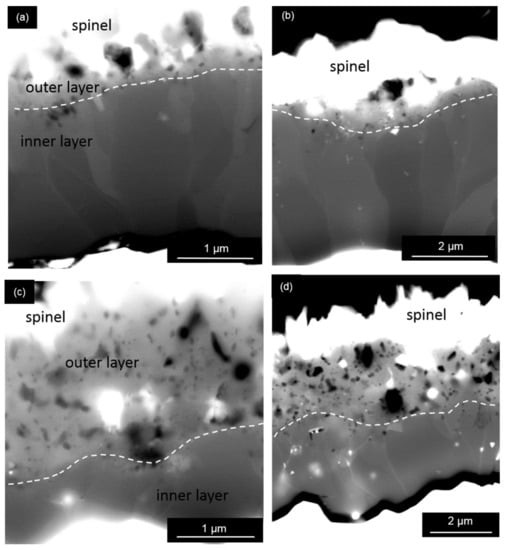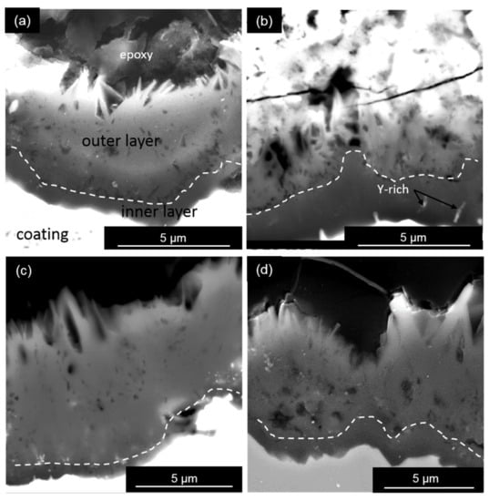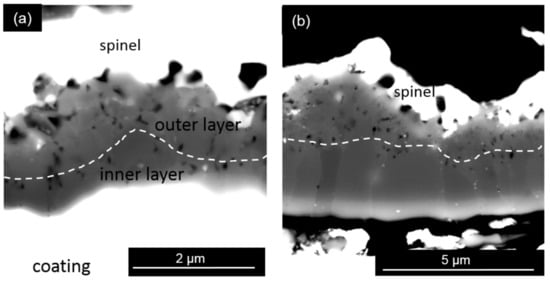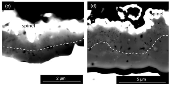 The formation and growth of TGO play an important role in its subsequent thickening []; therefore, the oxidation behavior of coatings can be evaluated by studying the TGO growth behavior. Figure 4, Figure 5, Figure 6 and Figure 7 show the cross-sectional microstructure of the alumina scale formed on the coating surface at different oxidation temperatures. In general, a two-layer structure of alumina scale was observed, containing an outer porous layer and an inner dense layer. In addition, spinel could also be found covering the alumina scale, as shown in Figure 5, Figure 6 and Figure 7. However, the microstructure of the alumina scale is greatly dependent on the oxidation temperature. In Figure 4a,c, for 900 °C oxidation, a thick outer layer consisted of blade-like alumina and a thin dense inner alumina layer was observed with their boundaries marked by a dashed line. The formation of the blade-like Al2O3 resulted from the fast-outward growth of θ-Al2O3 for a short exposure time at a relatively low temperature (900 °C), which later transformed into α-Al2O3, as suggested by Liu et al. []. Because the growth rate of θ-Al2O3 is 10 times faster than α-Al2O3 [,], the inner alumina layer grows inward much slower than the outward growth of θ-Al2O3. Eventually, a two-layer structure of alumina scale, consisting of a thick porous outer layer transformed from fast-grown θ-Al2O3 and an inner slow-grown α-Al2O3, was observed. The formation of pores in the outer alumina layer gives evidence for the θ-to-α Al2O3 transformation due to the volume reduction, which is then incorporated in outer layer upon further alumina scale development [,]. After the full θ-to-α Al2O3 transformation, the inward diffusion of oxygen through the oxide scales dominates due to the slower Al outward diffusion through the oxides scale in a much more closely packed structure of α-Al2O3, rather than transient Al2O3 [,]. Therefore, the main alumina growth mechanism shifted from the outward grown outer layer to the inward growth of inner alumina layer after 5000 h oxidation, as evidenced by the similar outer layer thickness and the obvious thickening of inner layer in Figure 4. The outer layer of two coatings show similar morphology and thickness, indicating similar outward growth behavior. The inner alumina layer of the C1 coating, incorporated with Y-rich oxides (Figure 4b), is thicker than that of the C2 coating for 5000 h oxidation. This is because the Y-rich oxide in the alumina provides a fast diffusion path for the Al, which leads to a faster inward growth rate of the alumina in the C1 coating [,,,,]. However, no such effect could be observed on the Ce-doped C2 coating, indicating that the 0.2 wt % Ce addition in the MCrAlX coating does not modify the Al diffusion in the alumina scale.