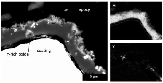 Figure 5 shows the cross-section of the TGO formed on the C1 and C2 coatings after isothermal oxidation at 1000 °C for different oxidation times, showing that the TGO consisted of spinel, an outer alumina layer, and an inner alumina layer. A thin outer layer and a columnar inner layer alumina scale could be observed on the C1 coating. However, the alumina scale formed on the C2 coating consisted of a thick porous outer layer and an equiaxed inner layer. Upon further oxidation to 5000 h, the thickening of inner layer in the C1 coating dominates the overall growth of the alumina scale after 50 h oxidation, as indicated by the relatively similar outer layer thickness. Figure 6 shows EDS mapping of the alumina scale formed on the C1 coating after 5000 h oxidation at 1000 °C. Y-rich oxides incorporated in the alumina scale can be readily observed. No Ru could be identified in the TGO of the C1 coating by EDS, and no Ce could be identified in the TGO of the C2 coating by EDS. The formation of the columnar structure of the inner alumina layer in the C1 coating resulted from the segregation of the Y-rich oxide at the alumina grain boundaries. The segregation of the Y-rich oxide accelerates the Al grain boundary diffusion, which aids in the formation of the columnar structure []. No such influence from the Ce addition in the C2 coating can be observed. In addition, the much thicker porous outer layer on the C2 coating compared to that of the C1 coating indicates that the addition of Y in MCrAlX coatings suppresses the growth of θ-Al2O3 and enhances the fast development of a dense α-Al2O3 layer. However, the addition of Ce in MCrAlX coatings does not show the same positive effects as that of Y. A similar TGO microstructure can be observed on the C1 and C2 coatings after isothermal oxidation at 1100 °C for different oxidation times, as illustrated in Figure 7. It is worth mentioning that the outer alumina layer thickness of the C2 coating reached half of the overall alumina scale thickness at 800 h oxidation, indicating not only the inward growth of the inner alumina layer but also the growth of the outer layer contributing to the overall alumina scale growth in the C2 coating. In contrast, the influence of the outer alumina layer growth on the overall alumina growth is trivial in the C1 coating considering the relatively thin outer layer thickness of the C1 coating without much thickening after 800 h oxidation.