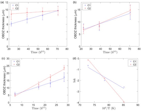 Figure 8 shows the evolution of the OBDZ thickness during oxidation versus the square root of oxidation time at different temperatures. As can be seen, the fitting of the regression models shows good correspondence with the experimental data, with coefficients of determination (R2) higher than 0.95. At 900 °C, the OBDZ thickness is quite large at 500 h for the C2 coating, which developed slower compared with that of the C1 coating. It corresponds to the microstructural observation in Figure 4 that the outward growth of the transient alumina on the C2 coating reached a certain thickness in a short time, resulted in a fast Al depletion (thick OBDZ) at 500 h. Once the transient alumina fully transformed into α-Al2O3, the overall growth of the alumina scale shifted to inward growth of the inner alumina layer. Due to the aforementioned Y effect, the inner layer of the C1 coating grew faster than that of the C2 coating, where Ce shows no such effect, leading to a faster overall alumina scale growth rate of the C1 coating. In the case of 1000 °C oxidation (Figure 5), the growth of the inner layer dominates the overall growth of the alumina scale in the C1 coating. However, the growth of the outer porous layer of the C2 coating also contributes to the overall growth of the alumina scale, giving a similar OBDZ growth rate. At 1100 °C, the larger OBDZ thickness growth rate of the C2 coating indicates that both the inner and outer alumina layers contribute to the overall growth rate of the alumina scale, leading to a larger growth rate of the C2 coating than of the C1 coating.