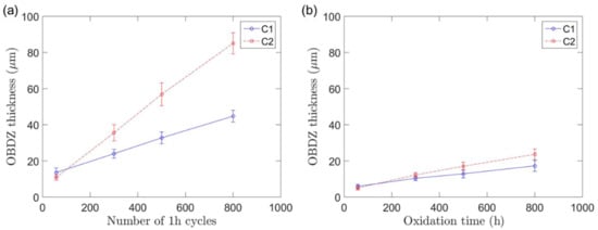 The OBDZ thickness of the C1 and C2 coatings after cyclic oxidation testing at 1100 °C (a) and isothermal oxidation testing at 1100 °C (b).