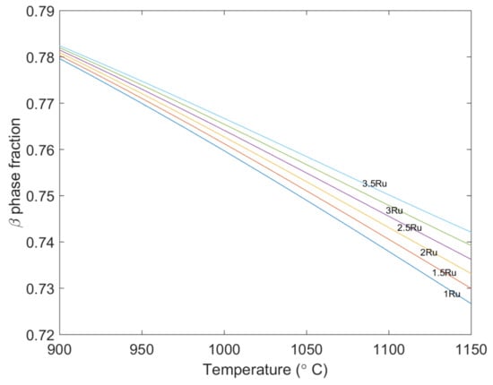 Because the simulation is based on the combination of diffusion and phase equilibrium calculation, the effect of Ru on the interdiffusion was further investigated by phase equilibrium calculation using Thermo-Calc, see Figure 10. Several different alloy systems with similar compositions to the C1 coating were chosen: starting with Ni27Co15Cr12.5Al + 1Ru (in wt %) and then increasing Ru to 3.5Ru with a step size of 0.5 wt % of Ru at the expense of Ni. It is clear that the β phase fraction decreased with the decreasing Ru concentration in the alloy, from 74% to 71.5% at 1100 °C, indicating that Ru stabilizes the β phase in the alloy systems. This result is consistent with [], which claimed that Ru greatly stabilizes the β phase by largely extending the β phase field in the phase diagram.