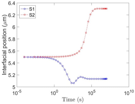 Figure 11 shows the interfacial position (phase boundary) movement of the S1 and S2 systems with time for up to 107 s at 1100 °C (Note that the original phase boundary for both S1 and S2 were at 5.5 μm and 800 h is 2.88 × 106 s). It can be seen that the interfacial position of both S1 and S2 changed with time and reached a new equilibrium state after 105 s because there was no interference from outside the system. Comparing S1 and S2, the interfacial position moved by 0.4 µm towards the γ phase region for S1 but 0.8 µm towards the β phase region for S2. This means that the β phase region had the tendency to grow in S1 but to shrink in S2.