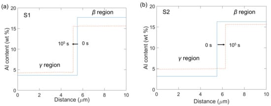 Al concentration profile of S1 (a) and S2 (b) at 0 s and 105 s simulation time from the moving phase boundary modelling. Al concentration profiles at other times were not included here for they were close to the data at 105 s. The γ phase region and β phase region were arranged from left to right with the interface at distance = 5.5 µm.