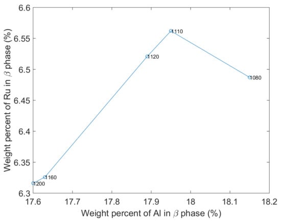 Projection of three-dimensional diagram with the weight percent of the Al in the β phase—x-axis, Ru in β phase—y-axis and temperature—z-axis. The temperature corresponding to each point has been marked.