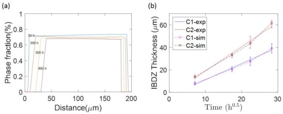 Simulation results of the β phase evolution of Y + Ru-doped C1 coating at 1100 °C (a). IBDZ thickness data of the C1 and C2 coating from the isothermal oxidation test and simulation at 1100 °C plotted versus square root of time (b) (the dotted line and solid line represented simulation results and the isothermal oxidation test data, respectively).