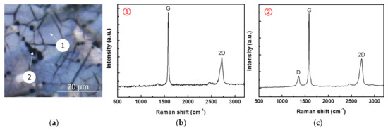 Raman spectra were obtained to indirectly determine the thickness of the graphene film formed on the surface of Ni–P–G. An image of Ni–P–G with the Raman spectra at regions ① and ② are provided in Figure 2. It can be observed that the Raman spectrum of region ① displays two characteristic peaks at 1580 cm−1 and 2700 cm−1, which separately correspond to G and 2D Raman bands. The intensity of the 2D band is lower than that of the G band with the IG/I2D ratio around 2.45. This means that the obtained graphene is multilayered rather than single-layered, and the layer number is around 5–10 [24]. By contrast, although the Raman spectrum of region ② displays a similar IG/I2D ratio as that of region ①, a characteristic peak at 1350 cm−1 corresponding to a defect/disorder induced D band is found. The ID/IG ratio strongly depends on the defect density of the graphene, and thus, it can be used to calculate the number of defects using the empirical formula below [25]: